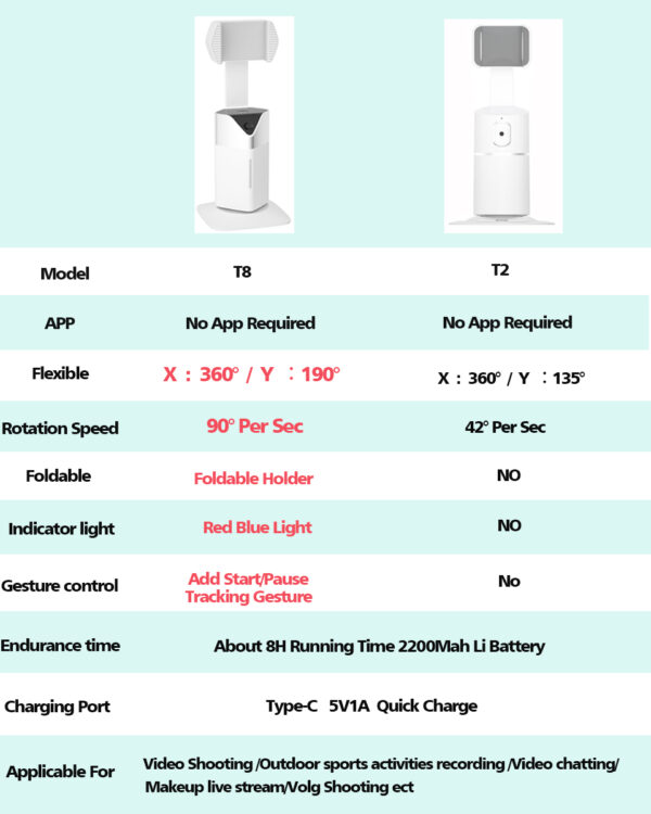 T8 face auto tracking phone stand, auto tracking through built-in AI Technology chip to auto recognize follow-up tracking, without download any APP that does not use cellphone memory, easy installation turn on and start work, T8 net weight about 300g, detachable and foldable lightweight design, It doesn’t take up much space , convenient for travel shooting.